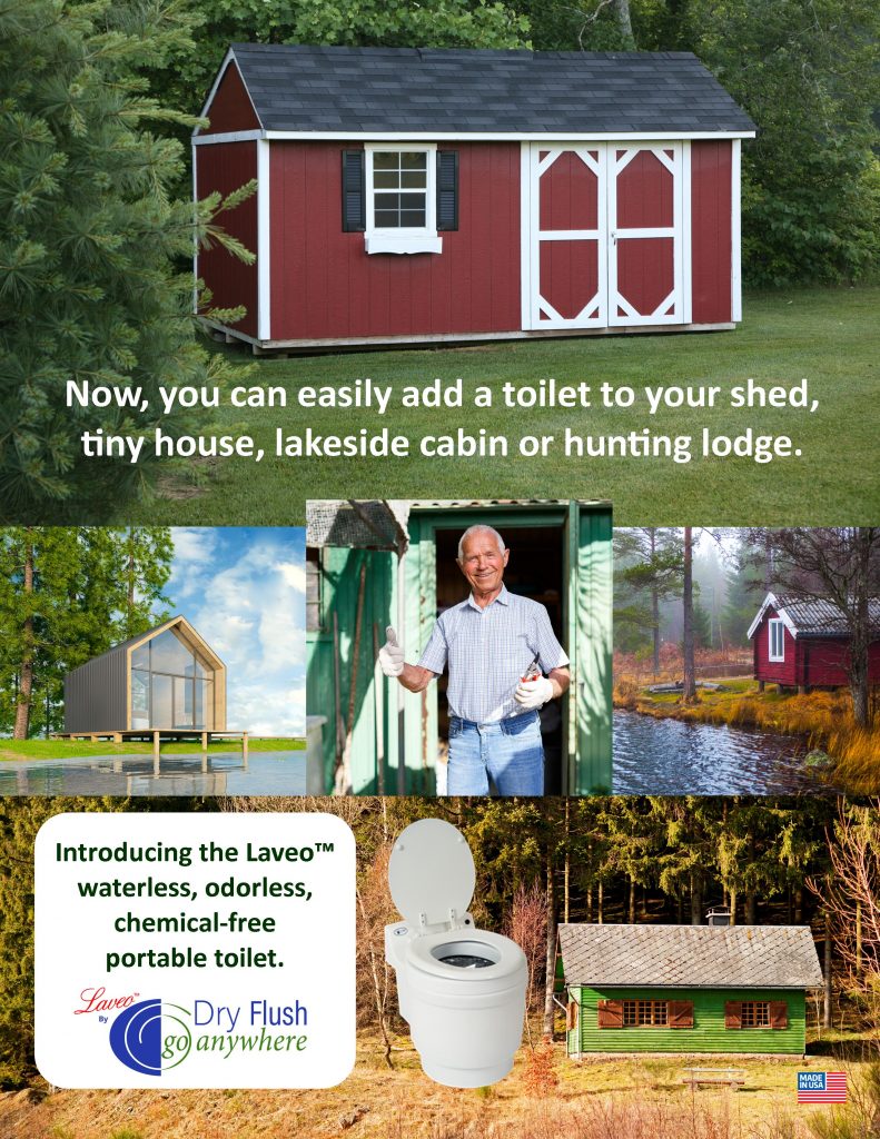 Now there is an innovative, practical and economical way to add or expand the toilet capacity of your shed, tiny home, lake home or hunting lodge without expensive blueprints, permits and renovations. The Laveo™ portable electric toilet by Dry Flush is waterless, odorless, chemical-free, low maintenance and will not freeze. The compact portable electric toilet measures 16”W x 20”D x 18”H and weighs just 29 lbs.
